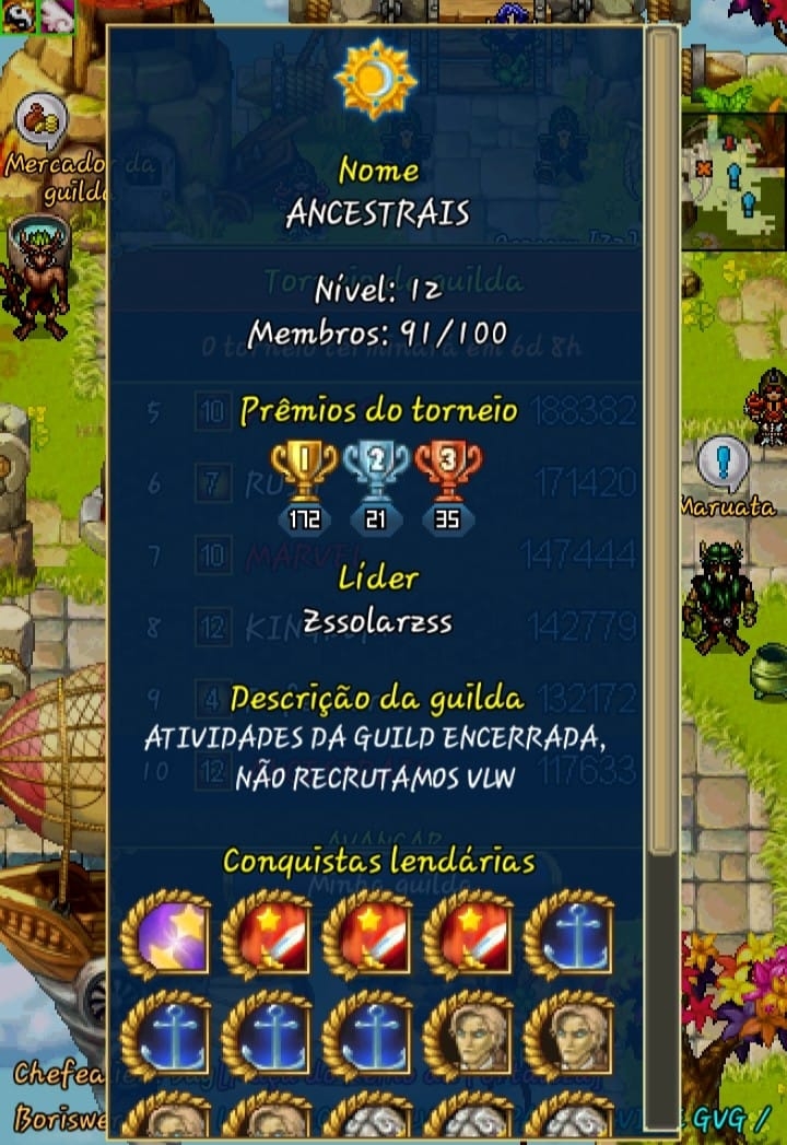 Com uma experiência de 6 anos, a ANCESTRAIS se tornou uma das maiores guildas do jogo e sem sombra de dúvida a maior do servidor Brasileiro. Foram muitas conquistas lendárias e anos de supremacia. Após um periodo turbulento nos últimos meses, a guilda encerra suas atividas no término do evento da Primavera.